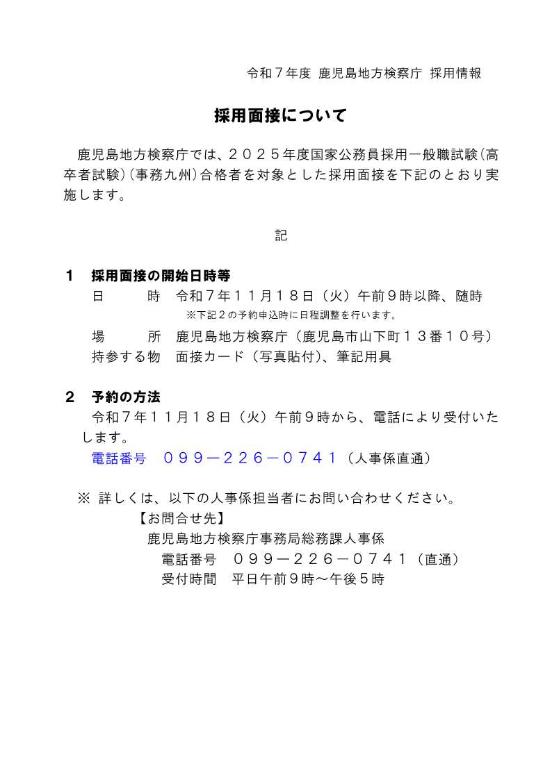 国家公務員採用一般職試験(高卒者試験)の採用面接について、最終合格発表日の令和7年11月18日(火)午前9時から受付を開始し、同日から実施いたします。