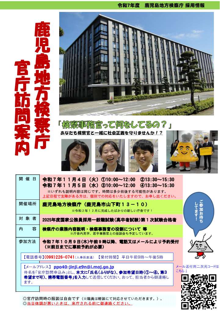 上記日程(それ以外の日程でも対応いたします)にて、鹿児島地方検察庁において「官庁訪問(業務説明会等)」を実施いたします。