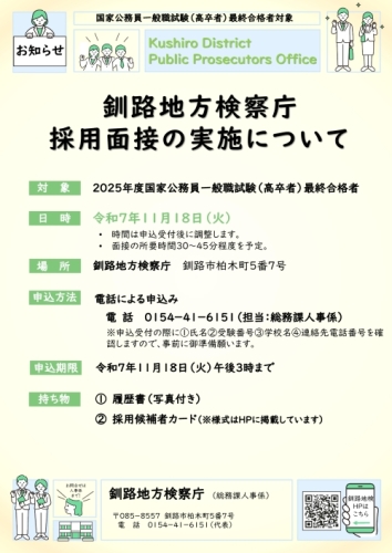 釧路地方検察庁では、2025年度国家公務員採用一般職試験(高卒者試験)の最終合格者を対象とした採用面接を下記のとおり実施します。