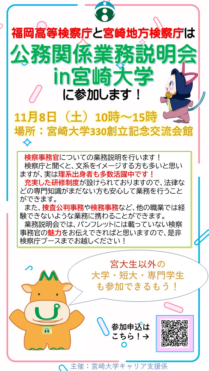 多くの官公庁が参加を予定しており、福岡高等検察庁と宮崎地方検察庁も参加し、検察事務官の業務説明等を行う予定です。