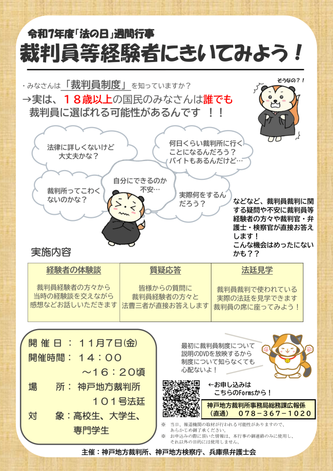 令和7年11月7日(金)に、法曹三者(神戸地方裁判所、神戸地方検察庁、兵庫県 弁護士会)による 法の日週間行事:「裁判員等経験者にきいてみよう!」 を実施いたします。 裁判員等経験者の生の声を聴くことができる貴重な機会となっています。 応募先など、詳しい内容は神戸地方裁判所ホームページでご確認ください。 神戸地方裁判所HPへのリンク先は、下の画像をクリック、またはタップしてください。