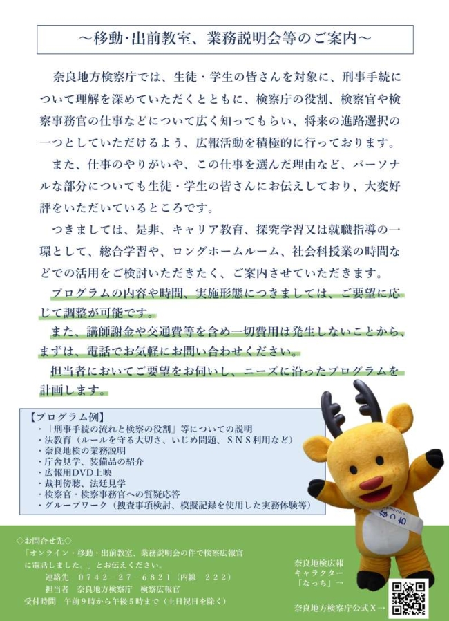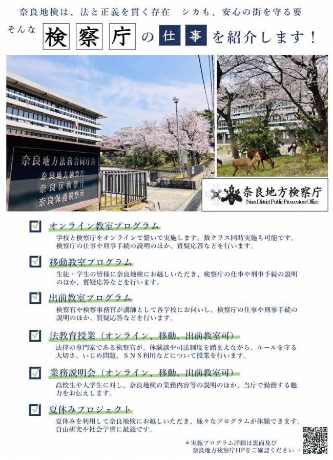 奈良地方検察庁では、検察庁の業務等について国民の皆様に知っていただけるよう、検察官や検察事務官が学校などにお伺いして業務説明などを行う「出前教室プログラム」や、検察庁に来ていただいて、業務説明などを行う「移動教室プログラム」を実施しています。